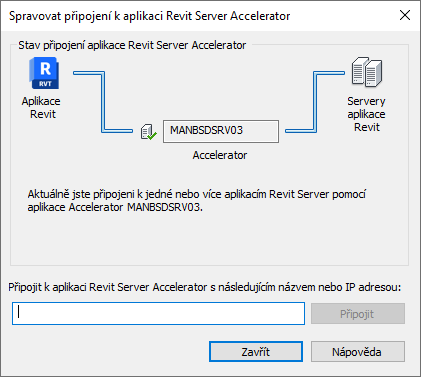 Následující postup použijte, pokud chcete zkontrolovat stav připojení k akcelerátoru, který byl přiřazen k vašemu umístění (jak je určeno proměnnou prostředí RSACCELERATOR2023 Release vašeho systému), a pokud je to nutné, určete jiný akcelerátor. Pokud ztratíte síťové připojení k akcelerátoru aplikace Revit Server nebo jej nechcete použít, budete připojeni přímo k serverům aplikace Revit Server.