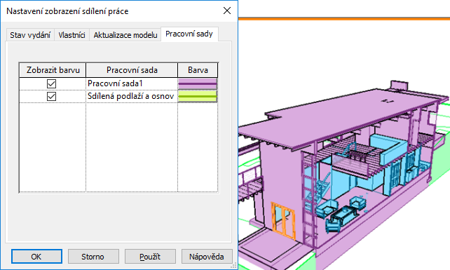 Pracovní sady. Pracovní sady se v modelu vizuálně odlišují pomocí barev.