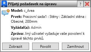 Oznámení se zobrazí na dobu přibližně 30 sekund. Po tomto čase můžete použít dialog Požadavek na úpravy ke kontrole nevyřízených požadavků a učinit opatření ve věci požadavků členů týmu.
