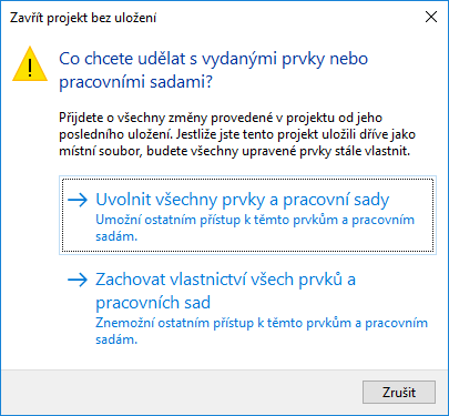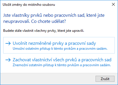 - Kliknutím na možnost Zachovat vlastnictví všech prvků a pracovních sad si ponecháte ve vlastnictví vypůjčené prvky a svoje pracovní sady. Vámi provedené změny budou ztraceny.