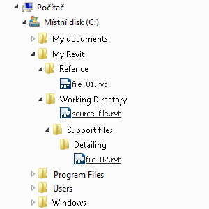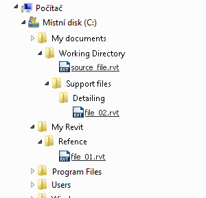 Nyní se ze všech původních absolutních cest staly nevyřešené cesty, protože odkazují na konkrétní místo. Přeruší se i relativní cesta k souboru file_01.rvt, protože se tento soubor nacházel mimo pracovní adresář a nepřesunul se tedy spolu s ním.