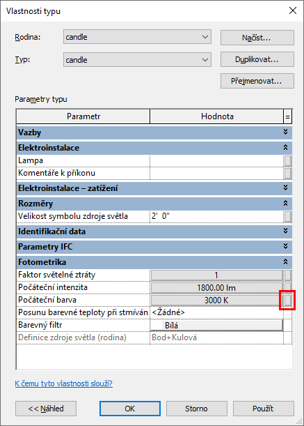 Při propojení těchto parametrů a přidání lustru do modelu budovy můžete v projektu nastavit parametr Počáteční intenzita (nebo jiné propojené parametry) u lustru jako celku. Nelze změnit počáteční intenzitu jednotlivých svíček v lustru.