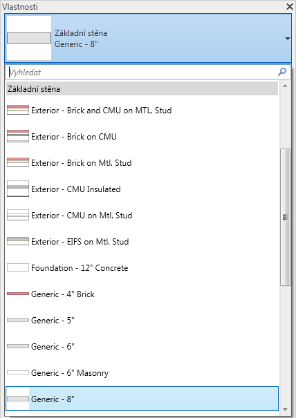 Nástroj Výběr typu identifikuje aktuálně vybraný typ rodiny a umožňuje vybrat v rozevíracím seznamu jiný typ.