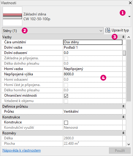 Ve většině případů (výjimky jsou uvedeny níže) se na paletě Vlastnosti zobrazují jak vlastnosti instance, které může uživatel upravovat, tak i vlastnosti instance, které jsou určeny pouze ke čtení (vystínované). Vlastnost může být určena pouze ke čtení proto, že její hodnotu vypočítává nebo automaticky přiřazuje software, případně z toho důvodu, že závisí na nastavení jiné vlastnosti. Například vlastnost stěny Nepřipojená výška lze upravovat jen v případě, že je u její vlastnosti Horní vazba nastavena hodnota Nepřipojená. Specifické závislosti jsou uvedeny v popisech vlastností instancí jednotlivých typů prvků.