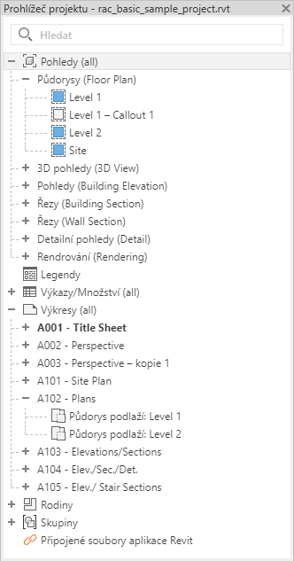 Prohlížeč projektu zobrazuje logickou hierarchii všech pohledů, výkazů, výkresů, rodin, skupin a dalších částí aktuálního projektu. Jak postupně rozbalujete a sbalujete jednotlivé větve, zobrazují se položky nižší úrovně.