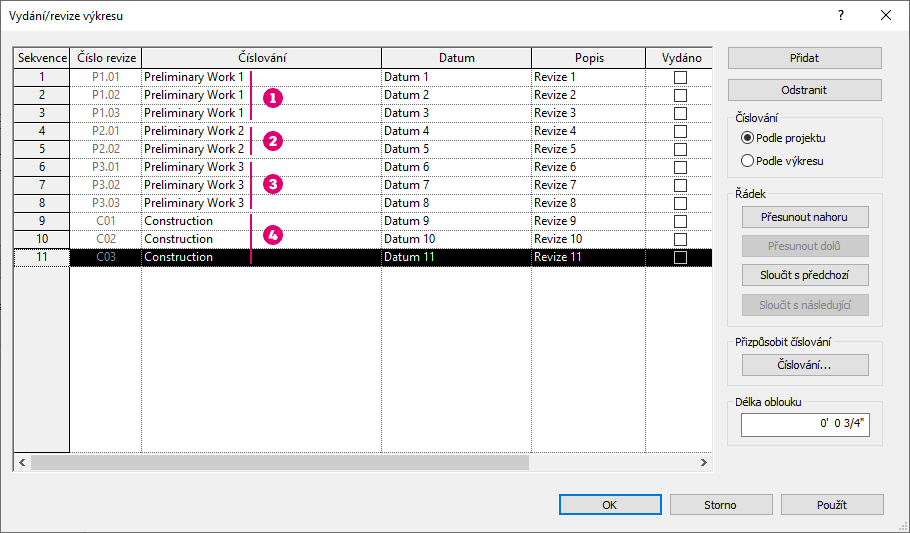 Naučte se, jak vytvářet a přiřazovat vlastní posloupnosti číslování revizí v projektech.