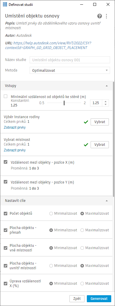 Pomocí možnosti Vytvořit studii vyberte typ studie a definujte cíle a kritéria studie. Potom kliknutím na tlačítko spustíte studii a vygenerujete alternativy návrhu. Během procesu generování můžete pokračovat v práci na modelu.