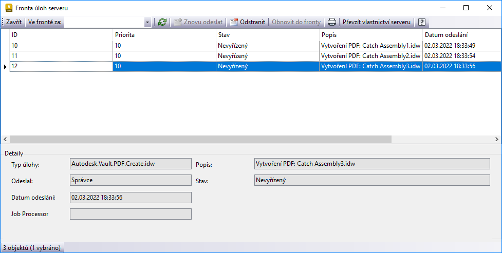 Fronta serveru úloh je seznam nebo fronta úloh odeslaných klienty (aplikace Inventor, AutoCAD, Vault či Autoloader) a čekajících na zpracování. Tato fronta je uložena na serveru Vault Server a je jím také spravována.
