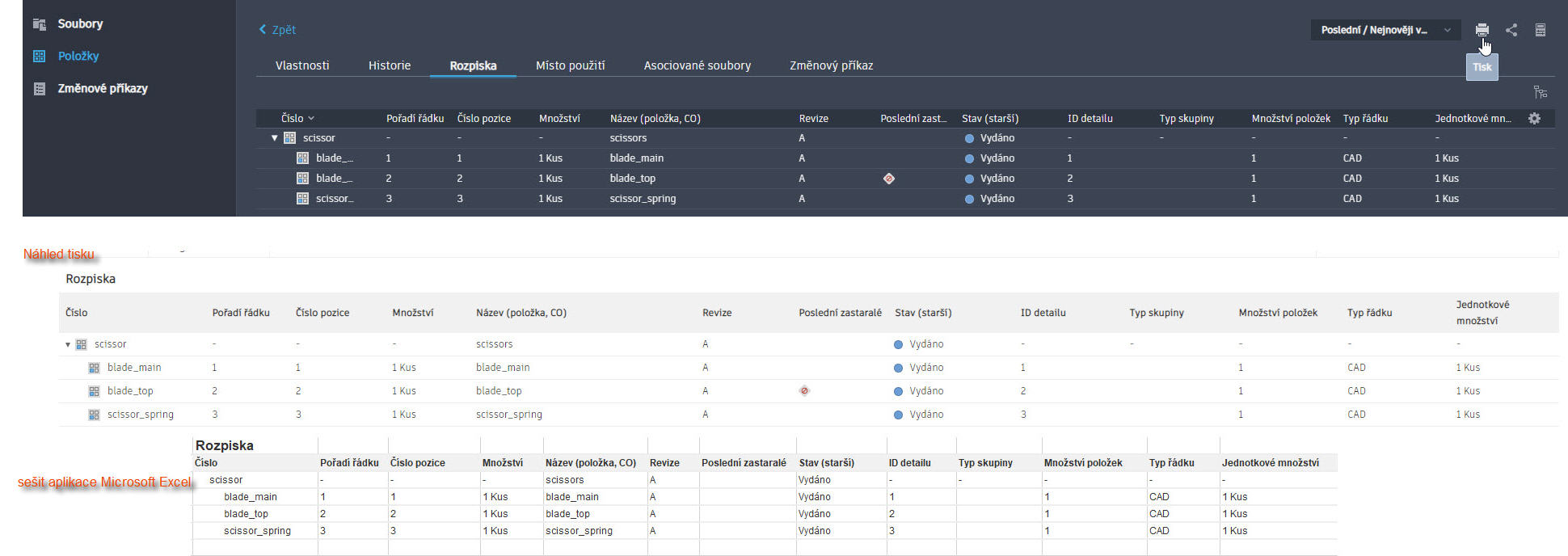 - Na kartě podrobností souborů, položek nebo změnových příkazů klikněte na ikonu Tisk.