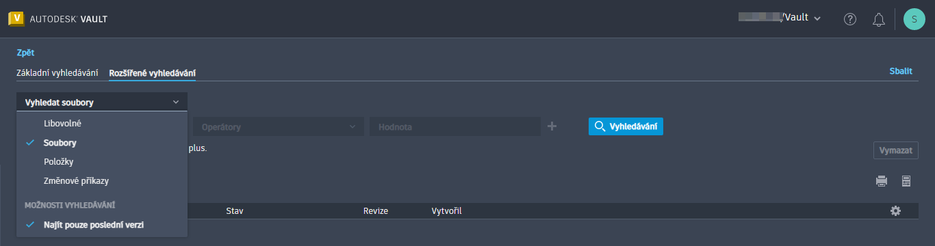 Chcete-li provést rozšířené vyhledávání, je nutné určit vlastnost, podmínku a hodnotu. Vyhledávání můžete spustit kliknutím na tlačítko Vyhledat na panelu navigace nebo kliknutím na tlačítko Rozšířené, které se nachází vedle pole vyhledávání.