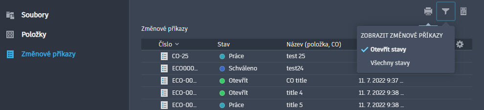 Díky možnosti filtrování zobrazení můžete zobrazit pouze změnové příkazy, které jsou v otevřených stavech (Vytvořit, Otevřít, Pracovat, Zkontrolovat, Schváleno, Zamítnuto), případně můžete vybrat možnost Všechny stavy a zobrazit všechny změnové příkazy včetně těch ve stavu Zavřeno nebo Zrušeno.