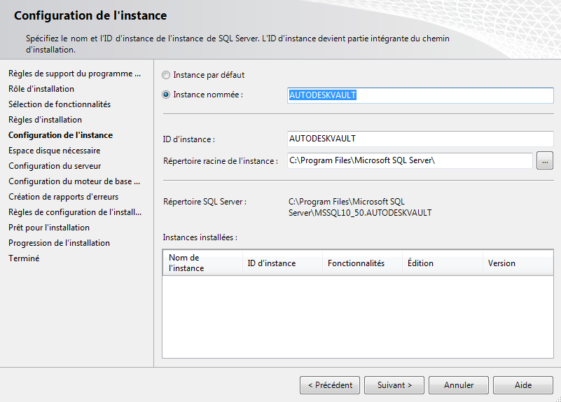 - V okně Konfigurace instance vyberte položku Pojmenovaná instance a zadejte název. Můžete například použít řetězec AutodeskVault, nebo zadat vlastní název instance.