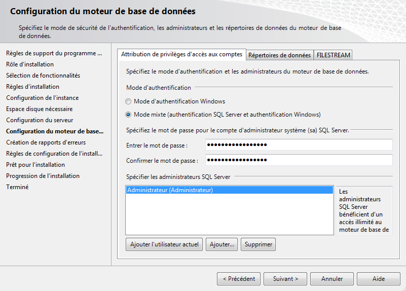 - Vyberte možnost Smíšený režim ověřování a nastavte heslo SA. Jako výchozí heslo účtu SA bude při výchozí instalaci použito heslo AutodeskVault@26200.