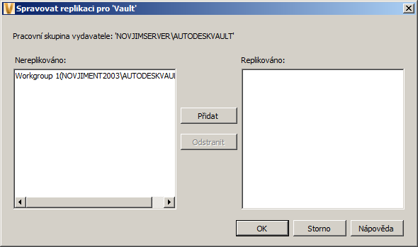 Replikace je proces kopírování dat z jednoho serveru na druhý server. Servery jsou obvykle umístěny ve dvou různých fyzických umístěních. Tato konfigurace umožňuje použití prostředí aplikace Vault ve dvou místech, není proto nutné stahovat velké soubory CAD pomocí sítí WAN.