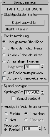 Mit den Optionen im Rollout "Grundparameter" können Sie ein Partikelsystem erstellen, seine Größe festlegen und ändern und das Verteilungsobjekt auswählen. Außerdem können Sie mit ihnen die ursprüngliche Verteilung der Partikel im Verhältnis zur Geometrie des Verteilungsobjekts sowie die Ausgangsgeschwindigkeit der Partikel vom Verteilungsobjekt weg festlegen. Hier können Sie auch angeben, wie die Partikel im Ansichtsfenster angezeigt werden sollen.