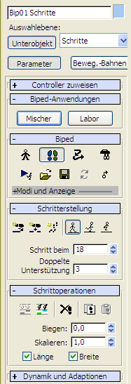 Durch die automatische Anpassung können Animationen für den Biped schneller erstellt und bearbeitet werden. Falls erforderlich, kann der Animator die Anpassung des Bipeds mit den Parametern unter Sperrungen anpassen im Rollout Dynamik und Adaptionen verhindern.