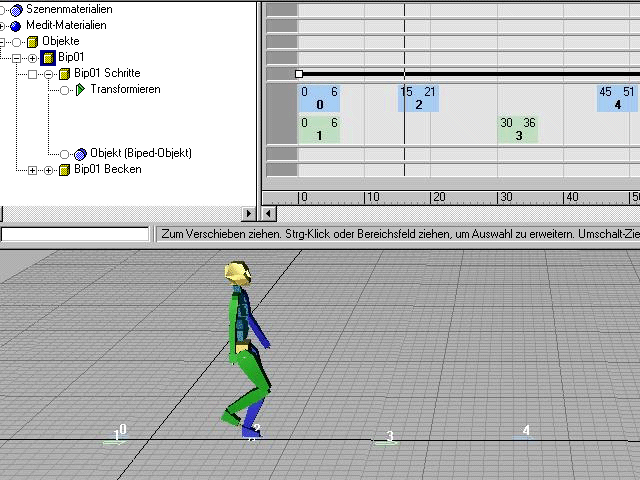 Schritte werden verwendet, um den Fuß im Boden zu verankern. Dasselbe Ergebnis erzielen Sie bei der Freiformanimation, indem Sie für die Füße Aufsetz-Keys erstellen.