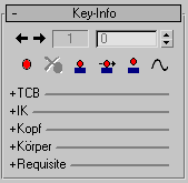 Je nachdem, welcher Teil des Bipeds ausgewählt ist und ob es einen aktuellen Key gibt, sind bestimmte Bereiche im Rollout "Key-Info" nicht verfügbar. Körper vertikal, Körper horizontal und Körperdrehung beziehen sich auf die drei Spuren, die zum Animieren des Massenmittelpunkts des Bipeds verwendet werden. Wählen Sie auf dem Rollout "Spurauswahl" einen der drei Spuren des Massenmittelpunkts, und suchen Sie dann mit "Nächster Key" oder "Vorheriger Key" einen Key, den Sie bearbeiten möchten.