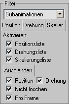 - Subanimationen Der Subanimationenfilter verwaltet die Subanimation von Biped-Objekten. Wenn Sie auf eine Schaltfläche klicken, die einer Transformation entspricht (Position, Drehung oder Skalierung), wird ein Dialogfeld angezeigt, in dem Sie dieser Transformation einen Controller zuweisen können. Controller, die auf diese Weise zugewiesen werden, wirken nur auf die ausgewählten Biped-Teile. Diese Option eignet sich daher gut, um Controller mehreren Biped-Teilen gleichzeitig zuzuweisen. Zusätzlich ist die Möglichkeit gegeben, die drei Listen-Controller selektiv zu aktivieren bzw. zu deaktivieren. Die Erstellung von Subanimationen wird unterbunden, falls diese bereits existieren.