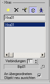 - (nur Bewegungsgruppe) Weist das übergeordnete Objekt neu zu. Klicken Sie auf diese Schaltfläche, um sie zu aktivieren. Klicken Sie dann in einem Ansichtsfenster auf ein anderes Körperteil desselben Bipeds. Das Körperteil, das Sie auswählen, wird zum übergeordneten Objekt des Schwanzes.