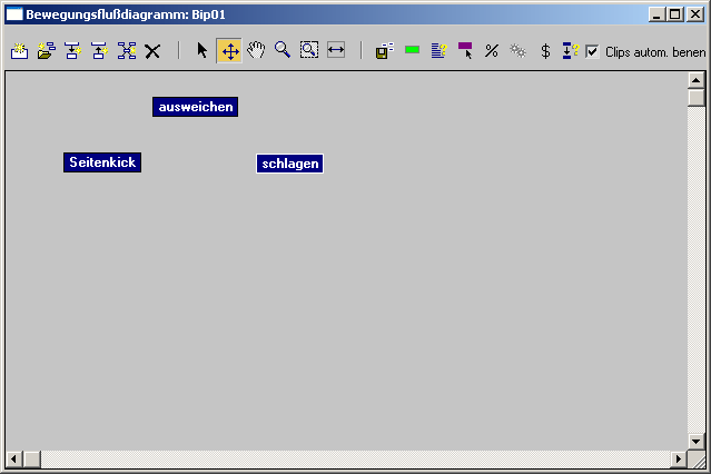 Skripts, Übergänge und Clip-Referenzen werden in einer Bewegungsfluss-Editordatei (MFE) für die spätere Bearbeitung gespeichert. In diesem Format können Sie einen Bewegungsfluss und ein Skript aus einem Biped generieren und zur späteren Bearbeitung in ein anderes Biped laden.