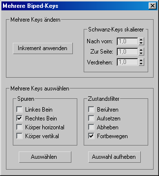 Um beispielsweise alle Keys für das linke Bein im Bewegungszustand (dem Zustand des Beins zwischen den Schritten) zu wählen, aktivieren Sie die Option "Linkes Bein" und den Filter "Zustand verschieben", und klicken Sie anschließend auf "Auswählen".