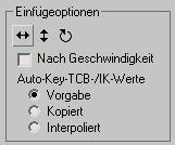 - Interpoliert Bei dieser Option wird eine Interpolation aus der Animation, in die Daten eingefügt werden, zur Bestimmung der TCB-Werte verwendet. Beim Einfügen an Key-Positionen werden deren TCB-Werte beibehalten. Dasselbe gilt für bestehende IK-Werte. Ist kein Key vorhanden, werden die IK-Werte anhand der zeitlichen Position zwischen dem vorherigen und dem folgenden Key ermittelt.