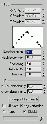 fügen Sie die Haltung erneut ein. Für den neuen Key wird der Durchschnitt aus den Werten des vorhergehenden und des folgenden Keys ermittelt. Für "Nachlassen zu" bzw. "Nachlassen von" werden die Werte 5 bzw. 25, für "TCB" 15 und für "IK-Verschmelzung" 0,25 eingestellt. Aus dem vorigen Key wird "Körperraum" übernommen.