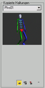 In Character Studio können Sie mehrere Kopie-/Einfügepuffer für jeden der drei Modi (Haltungs-, Stellungs- und Spurmodus) speichern. Diese Puffer sind in der Dropdown-Liste "Kopierte Haltungen/Stellungen/Spuren" verfügbar; der aktive Puffer, den die Schaltflächen zum Einfügen verwenden, ist derjenige, dessen Name im Feld oben in der Liste sichtbar ist. Ein Miniaturbild zeigt eine Vorschau dessen, was im aktiven Puffer gespeichert ist.