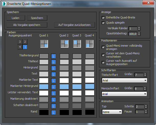 Je größer dieser Wert ist, desto langsamer läuft die Animation der Anzeige des Quad-Menüs ab.