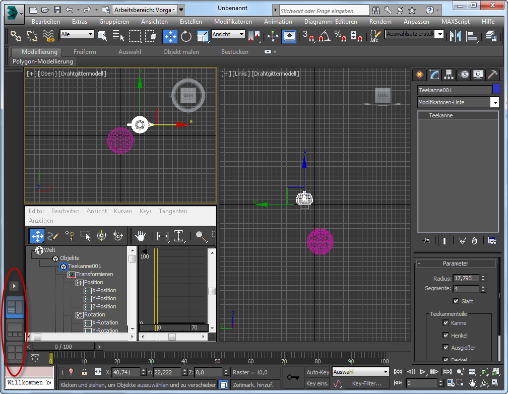 Die Funktion Ansichtsfenster-Layouts ermöglicht eine beliebige Anzahl verschiedener Arbeitsabläufe in 3ds Max. Diese Vorgehensweise beschreibt einen, der mehrere Ansichten einer Szene und zusätzlich ein erweitertes Ansichtsfenster ermöglicht.