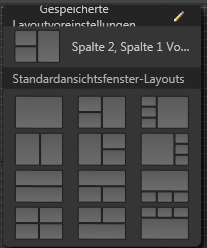 Das Menü Voreinstellungen Ansichtsfenster-Layouts wird geöffnet. Da Sie noch keine benutzerdefinierten Voreinstellungen gespeichert haben, enthält es nur die Standardansichtsfenster-Layouts. Für jedes Element gibt es ein Miniatursymbol, das das entsprechende Layout darstellt.