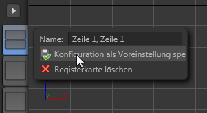 Die Registerkarten, die Sie erstellt haben, sind nicht mehr vorhanden. Registerkarten bleiben für spätere Sitzungen nicht erhalten. Um ein benutzerdefiniertes Layout in verschiedenen Szenen zu verwenden, nutzen Sie die Funktion Voreinstellungen entsprechend der nachfolgend beschriebenen Vorgehensweise.