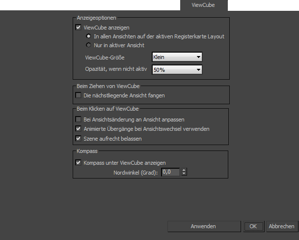 Diese Steuerelemente beeinflussen die Interaktion mit der ViewCube-Funktion. Alle Änderungen in den Einstellungen bleiben in folgenden Sitzungen erhalten.