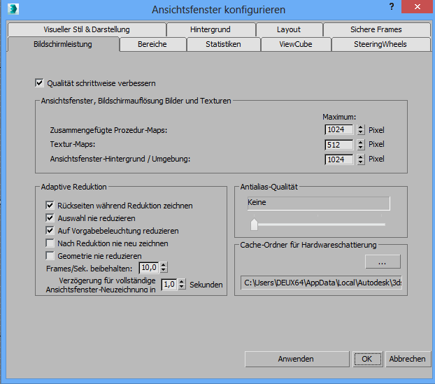 Für ältere Ansichtsfenster (Direct3D und OpenGL) passen Sie die Methoden zur adaptiven Neuzeichnung von Ansichtsfenstern in der Gruppe Adaptive Reduktion an.
