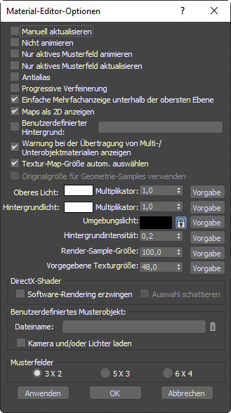 - Damit werden ohne Schließen des Dialogfelds "Material-Editor-Optionen" die aktuellen Einstellungen angewendet, mit Ausnahme der Änderungen im Bereich "Musterfelder". Diese Funktion ist praktisch, wenn Sie Lichtwerte für die Musterfelder anpassen.