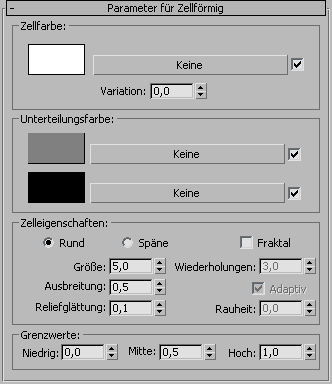 - Definiert das zellförmige Muster als fraktal und aktiviert damit die drei folgenden zusätzlichen Parameter. Vorgabe = Deaktiviert.