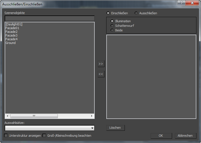 Im Dialogfeld "Ausschließen/Einschließen" wird festgelegt, welche Objekte nicht durch eine ausgewählte Lichtquelle beleuchtet werden, welche Objekte als in einem Mattheits-Renderelement berücksichtigt werden, oder welche Objekte nicht in durch den Quicksilver-Hardware-Renderer generierte Reflexionen einbezogen werden.
