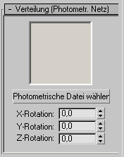 Das Rollout "Verteilung (Fotometrische Datei)" wird in der Modifikatorgruppe angezeigt, wenn Sie eine fotometrische Lichtquelle mit einer fotometrischen Netzverteilung erstellen oder auswählen. Mit diesen Parametern wählen Sie eine fotometrische Netzdatei aus und passen die Ausrichtung des Netzes an.