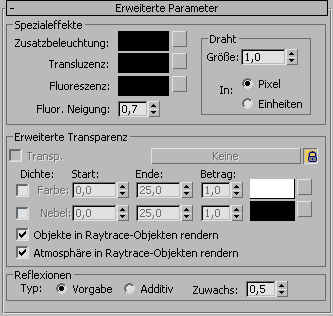 Mit dem Rollout "Erweiterte Parameter" für ein Raytrace-Material werden die Spezialeffekte, die Transparenzeigenschaften und die erweiterte Reflektivität dieses Materials gesteuert.