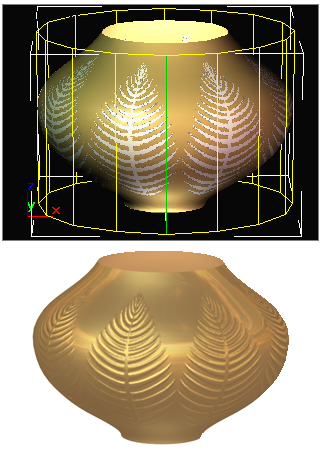 Die Verzierung der Vase ist ein Map, das durch Drehen des Gizmos für den Modifikator "UVW-Map" positioniert wurde.