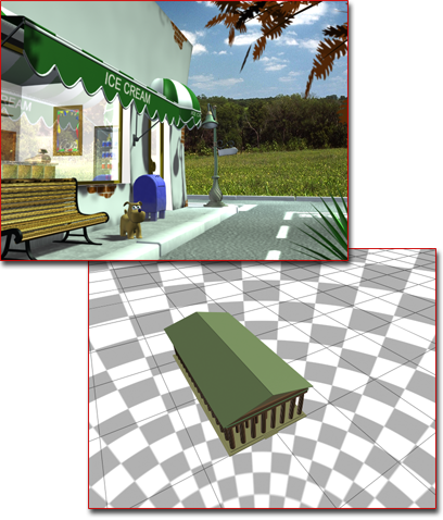 Unten: Das Bild zeigt ein Schachbrett-Map, das mit kugelförmigen Mapping-Koordinaten auf die Umgebung angewendet wird.