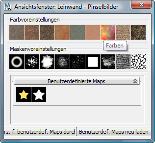 Das Dialogfeld besteht aus einer Reihe vordefinierter Farbpinsel, einer Reihe vordefinierter Maskenbilder, einer Liste der benutzerdefinierten Maps für die Verwendung Ihrer eigenen Bilder als Pinsel-Maps sowie zwei Schaltflächen zur Verwaltung der Maps. Um den Namen eines Pinselbilds anzuzeigen, bewegen Sie den Mauszeiger über die entsprechende Miniaturansicht.