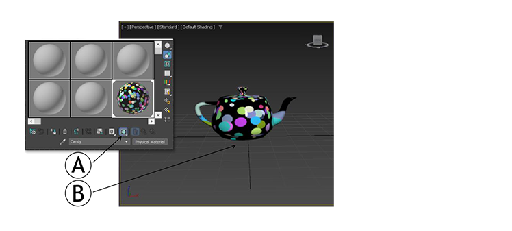 Wenn Sie ein Material in einer Bibliothek speichern, wird der Status dieser Schaltfläche ebenfalls gespeichert. Sie können Map-Materialien aus der Materialbibliothek in der Übersicht auf Objekte in Ihrer Szene ziehen und das Map-Material in den Ansichtsfenstern anzeigen. (Damit Maps korrekt angezeigt werden, muss für Grundkörperobjekte die Option „Mapping-Koordinaten generieren“ aktiviert sein; auf Netzobjekte muss ein Mapping-Modifikator angewendet sein.)