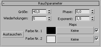 "Rauch" ist ein 3D-Map, das amorphe, auf Fraktalen basierende Turbulenzmuster generiert. Es ist in erster Linie zur Verwendung als animiertes Opazitäts-Map vorgesehen, um die Effekte von Rauch in einem Lichtstrahl oder andere wolkige, fließende Effekte zu simulieren.