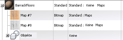 Untermaterialien/-Maps anzeigen aktivieren, zeigt die Hierarchie eines Materials auch die Maps an, die von diesem Material verwendet werden. Die Maps werden oberhalb der Objekte angezeigt, die das Material verwenden.