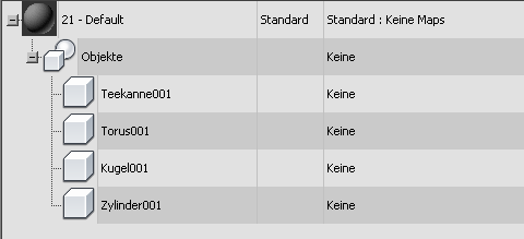 Im Hauptfenster des Fensterbereichs Szene des Material-Explorers befinden sich mehrere Spalten mit Informationen zu den Materialien in der Szene. Auf der linken Fensterseite befindet sich eine Hierarchie der Maps und Objekte. Standardmäßig werden in der Hierarchie Miniaturen für die verschiedenen Materialien angezeigt. Zu den anderen Steuerelementen gehören eine Menüleiste, ein Werkzeugkasten und an der linken Seite des Hauptfensters verschiedene Anzeigeschaltflächen.