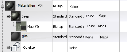 Um die einem Material zugewiesenen Objekte anzuzeigen, klicken Sie auf das Plus-Symbol (+), um die Hierarchie des Materials zu erweitern.
