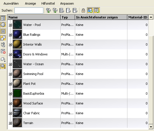 Im oberen Fensterbereich Szene des Material-Explorers können Sie nach allen Materialien in einer Szene suchen und diese verwalten.