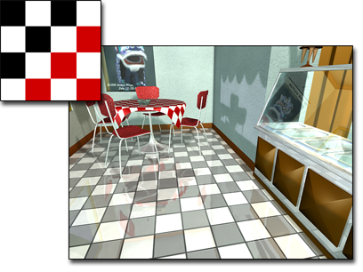 Schachbrett-Map für das Tischtuch und (in einer Zusammensetzung) für den Fußboden des Eisladens